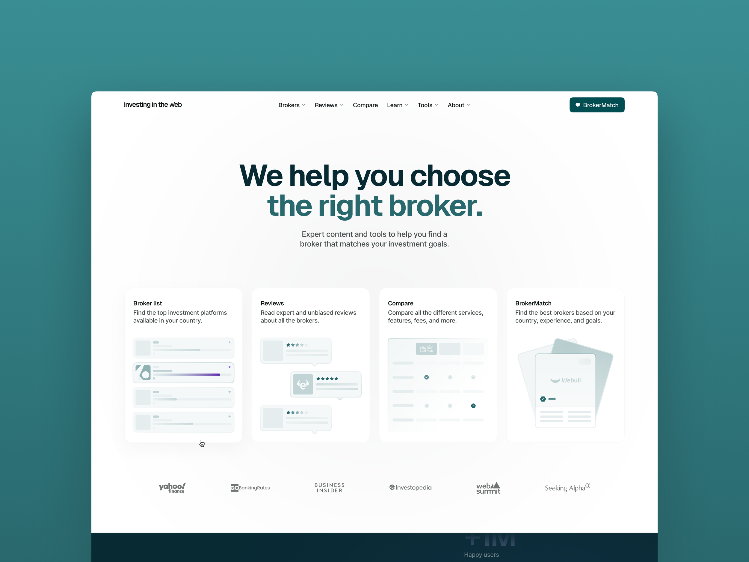 Investing in the Web is a fintech platform helping everyday people navigate the overwhelming world of online brokers — with expert reviews, comparison tools, and a broker-matching feature. It's a serious product in a crowded, trust-sensitive space. The brand needed to feel credible enough for someone making their first investment decision, and modern enough to sit comfortably next to the best fintech products on the market.